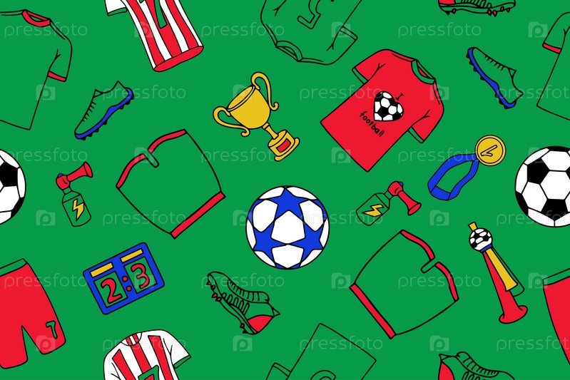 Бесшовный рисунок одежды и атрибутики футболистов. Футболки футбольной команды в стиле каракулей. Футбольная декоративная иллюстрация. Вектор