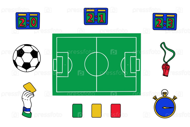 Набор иконок футбольных векторных предметов и атрибутов возле футбольного поля. Стиль Дуд. Вектор