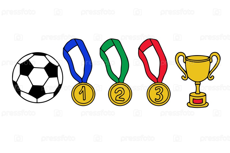 Концепция празднования футбольной победы. Векторная иллюстрация футбольного мяча с золотым кубком и медалями в стиле каракулей. Векторная иллюстрация