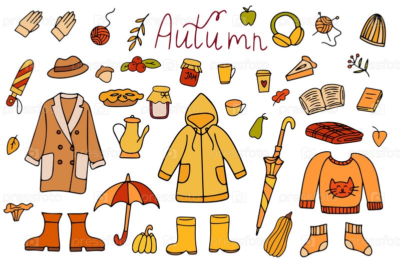 Уютные товары осеннего сезона, включая еду, одежду, аксессуары, урожай, книги. Ручные рисунки. Векторная иллюстрация