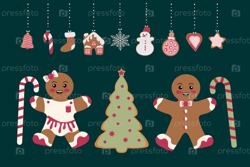 Веселая рождественская открытка. Пряники в виде снеговика, елочки и пряничных человечков и различные елочные игрушки. Празднование Нового года и Рождества