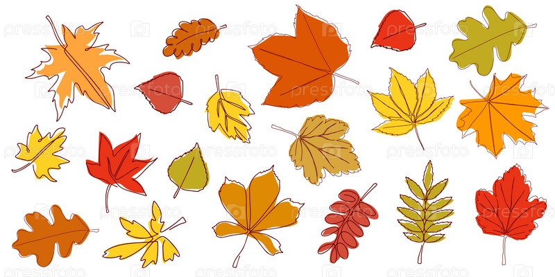 Набор ярких осенних листьев, нарисованных непрерывной линией. Осенний лист в стиле одной линии. Цветочный эскиз. Композиция из различных листьев. Листья простого контура. Векторная иллюстрация в минималистском стиле