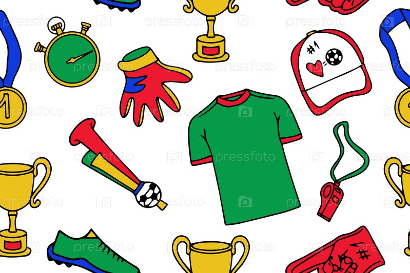 Бесшовный рисунок одежды и атрибутики футболистов в стиле каракулей. Футбольная декоративная иллюстрация. Вектор