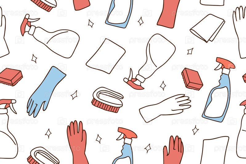 Бесшовный рисунок чистящего оборудования. Иконки линий очистки. Линия рисованного оборудования, чистящих средств и инструментов для мытья окон и различных поверхностей