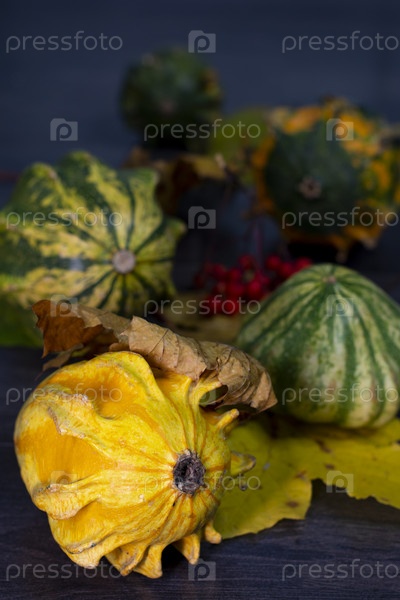 Осенний натюрморт с декоративной желтой тыквой на переднем плане, с опавшими листьями, тыквами, ягодами на заднем плане. Крупный план