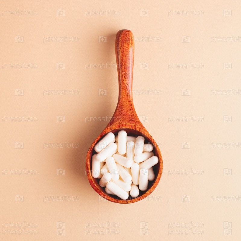 Вид сверху на деревянную ложку, наполненную белыми капсулами на бежевом фоне, квадратная композиция