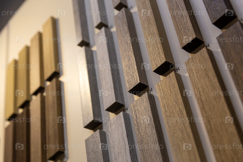 Стенд с образцами декоративных реек из дюрополимера в салоне по продаже напольных и настенных покрытий