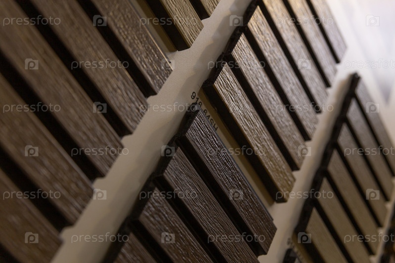 Стенд с образцами декоративных реек из дюрополимера в салоне по продаже напольных и настенных покрытий