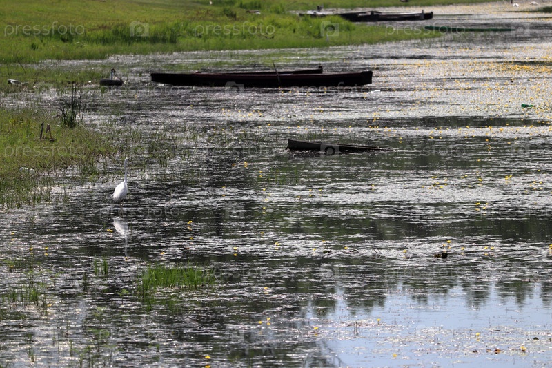 Цапля в поисках добычи на озере