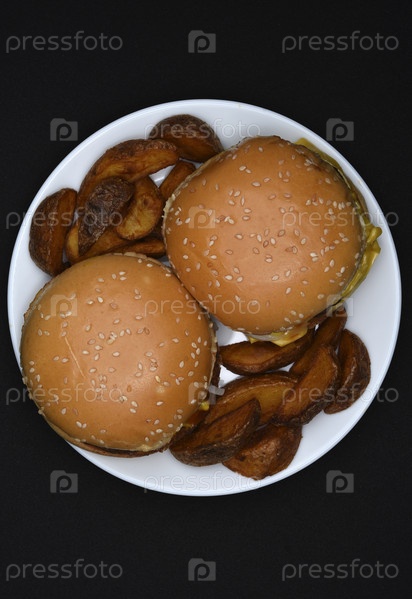 Гамбургеры и домашний картофель на белой тарелке. Вкусный завтрак. Быстрое питание