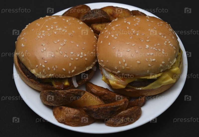 Гамбургеры и домашний картофель на белой тарелке. Вкусный завтрак. Быстрое питание