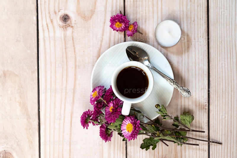 Осенняя композиция. Чашка кофе, блокнот, свежие цветы на белом фоне. Осень, осенняя концепция. Плоская планировка, вид сверху, пространство для копирования