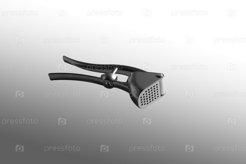 Пресс для чеснока. Крупный план. Изолированные на сером фоне