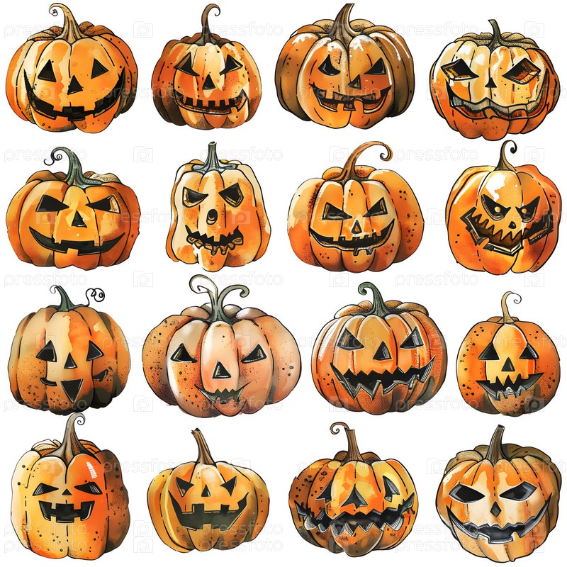 Акварель Счастливый Хэллоуин бесшовный узор с резной тыквой-фонарем Джека О в шляпе, жутким призраком, летающей летучей мышью, страшной головой зомби, свечами на белом фоне. Ручная роспись на тему 31 октября