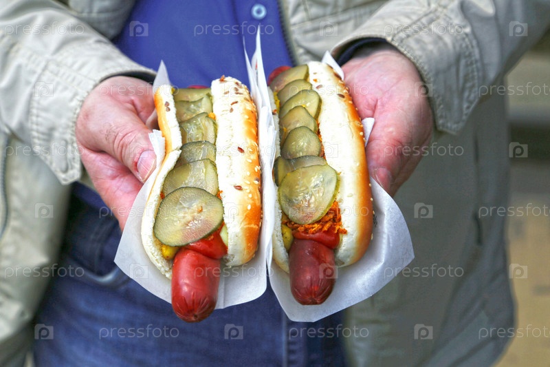 В руках мужчина держит два хот дога. Фастфуд, вкусная еда
