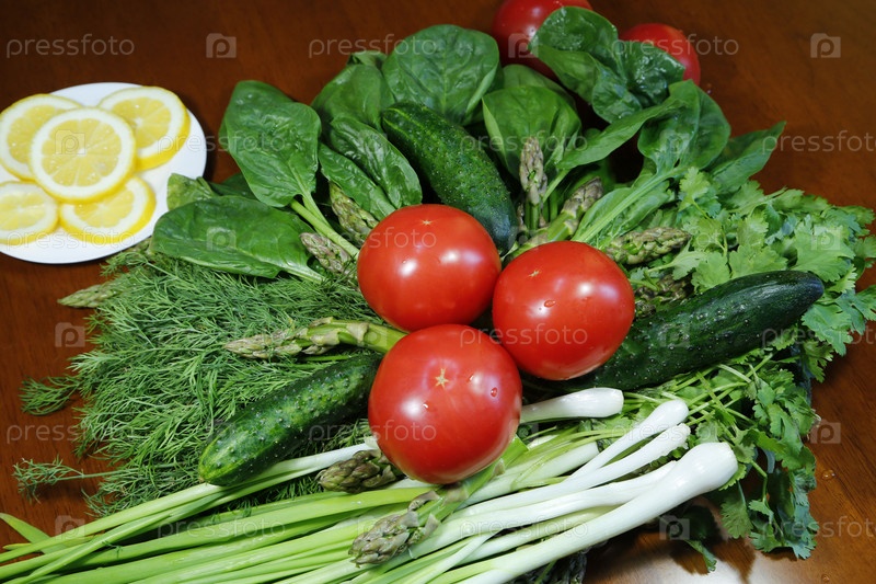 Овощи,зелень,спаржа,лимоны на столе