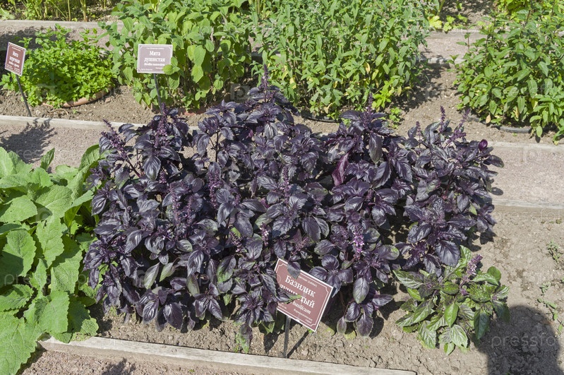 Ароматный базилик (лат. Ocimum basilicum) на постели с лекарственными растениями в Аптекарском саду (филиал ботанического сада МГУ).Москва
