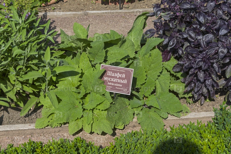 Сальвия склерея на кровати с лекарственными растениями в Аптекарском саду (филиал ботанического сада МГУ).Москва.Июль, солнечный