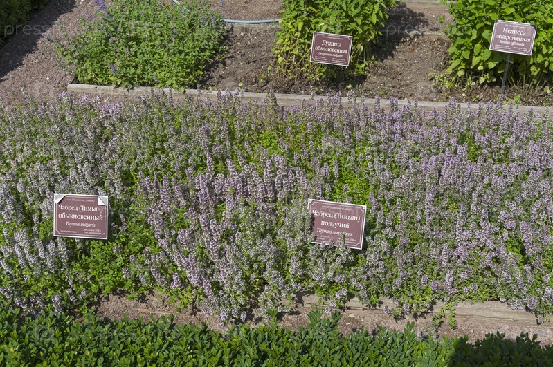 Цветящие обыкновенный тимур (лат. Thymus vulgaris) и ползучий тимур (лат. Thymus serpyllum) на трапезе с лекарственными растениями в Аптекарском саду (филиал ботанического сада МГУ).Москва Июль, солнечно
