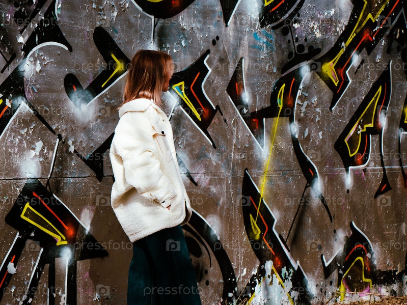 Девушка стоит на фоне стены с граффити