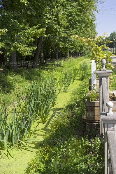 Заросшая ряской канавка с водой в Аптекарском Огороде (филиал ботанического сада МГУ). Москва