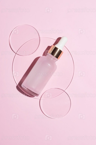 Сыворотка с пипеткой в чашке Петри на розовом фоне. Вид сверху, плоская планировка. Научная дерматологическая косметическая лаборатория. Натуральная медицина, косметические исследования, органические средства по уходу за кожей