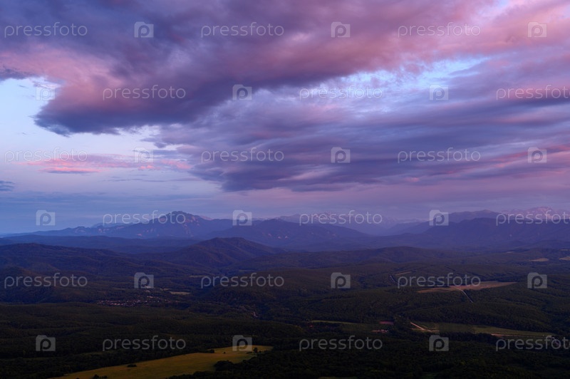 Захватывающая панорама заката с яркими темно-синими и красными облаками над горами