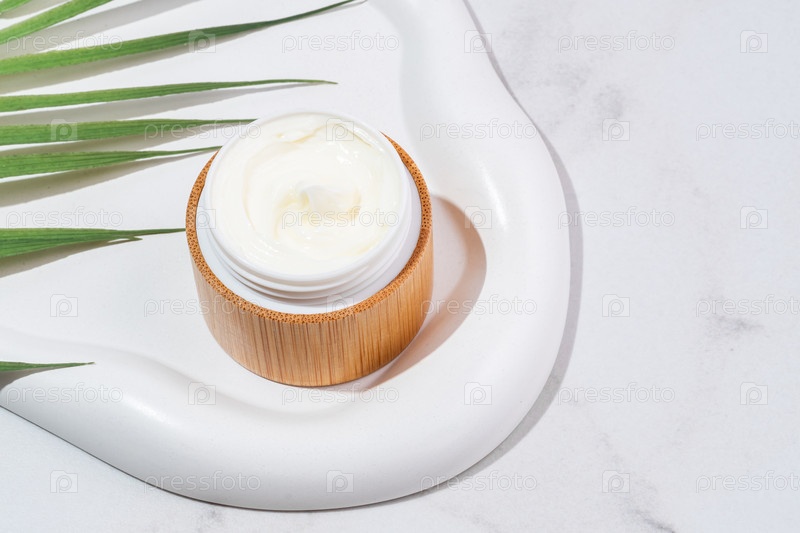 Косметический крем с зеленым пальмовым листом на светлом мраморном фоне. Дерматологические, компоненты для косметики