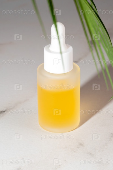 Косметическая стеклянная бутылка с капельницей для эфирных масел и сыворотки с зелеными листьями на мраморном столе. Концепция салона красоты и натуральной косметики