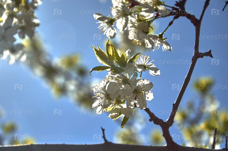 Белые весенние цветы на ветвях сливового дерева