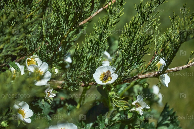 Пчела сидит на цветке белой клубники