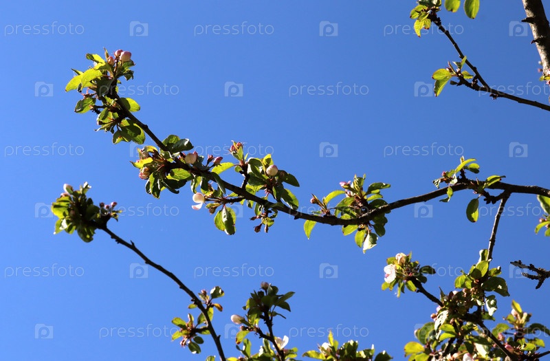 Цветущие ветки яблони на фоне голубого неба