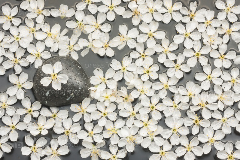 Фон белых цветов и черного камня в воде