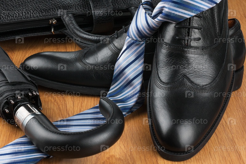 Классические мужские туфли, галстук, зонтик и сумка на деревянном полу