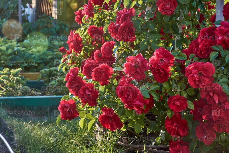 Красивый куст красной розы в саду летним утром