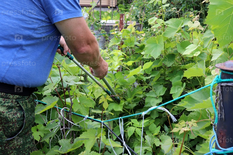 Мужчина-пенсионер обрезает куст винограда садовым секатором - верхняя часть тела, руки - крупный план