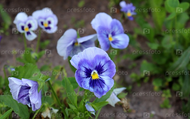 Голубые фиалки с сине-желтыми сердцевинами на клумбе