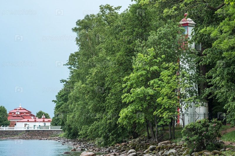 Старый маяк на берегу моря среди деревьев на фоне старинных зданий и набережной