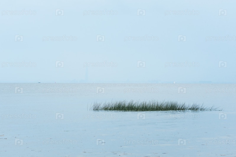 Туманный морской пейзаж, природный фон, вид на Финский залив в дождливую погоду