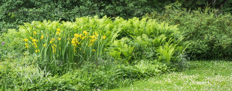 Желтые ирисы и папоротники на лужайке ландшафтного парка