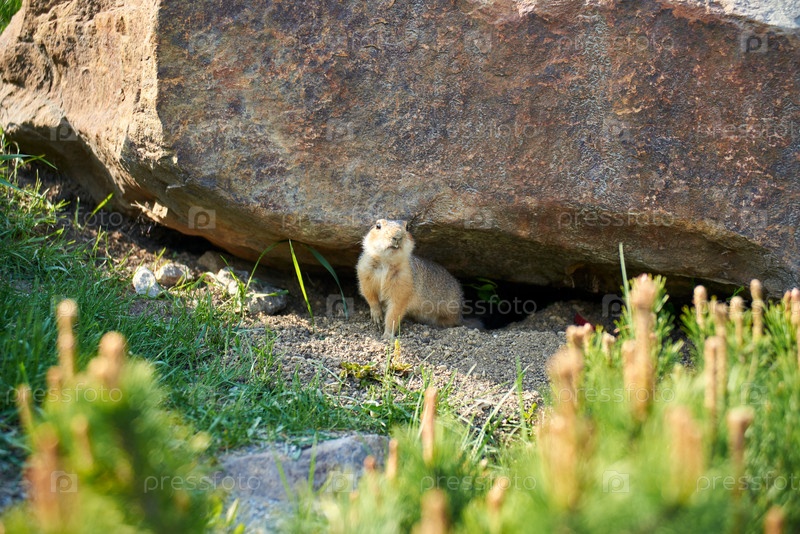 Забавный милый суслик осторожно выглядывает из-под камня в теплый солнечный летний день