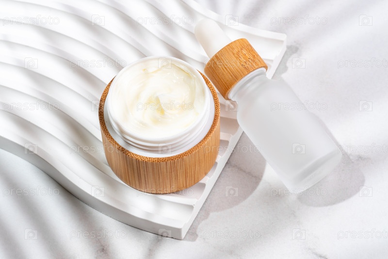 Бамбуковая баночка с кремом и флакон-капельница с маслом для лица на бетонном фоне. Макеты косметических контейнеров. Фон для презентации брендинга и упаковки. Концепция натуральной косметики по уходу за кожей