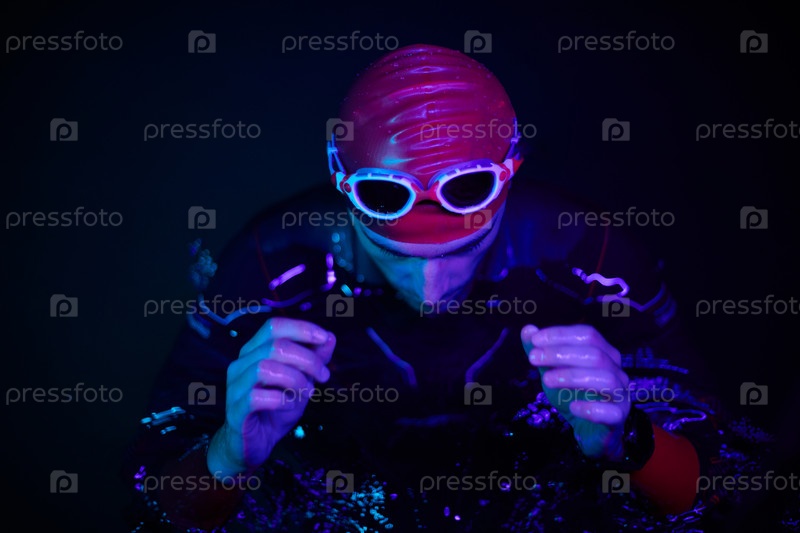 Настоящий пловец-триатлет, отдыхающий во время тяжелых тренировок при ночном неоновом гелевом свете