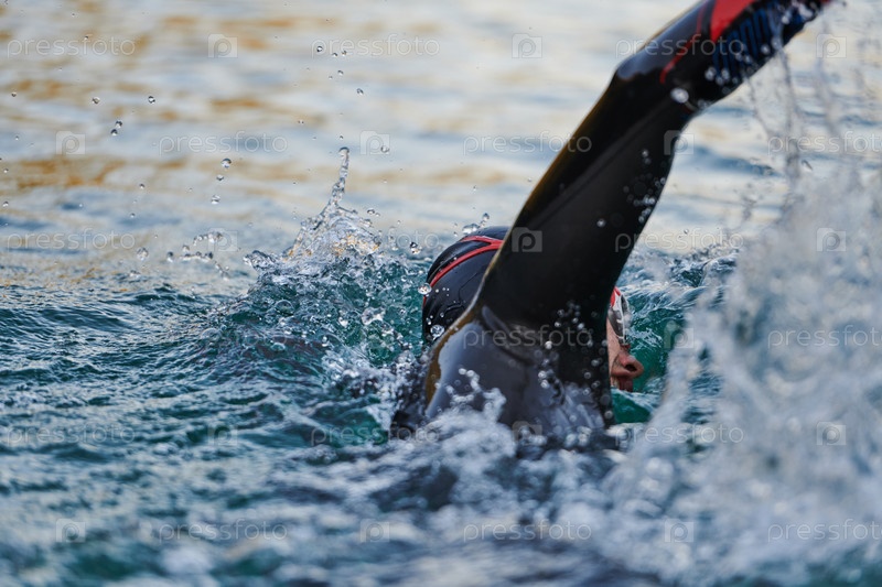 Спортсмен по триатлону плавает на озере на рассвете в гидрокостюме