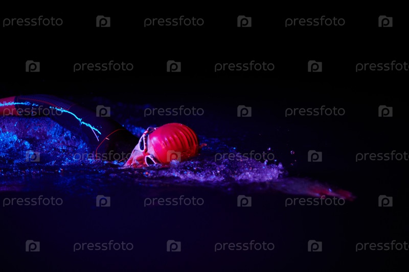 Настоящий пловец-триатлет, отдыхающий во время тяжелых тренировок при ночном неоновом гелевом свете