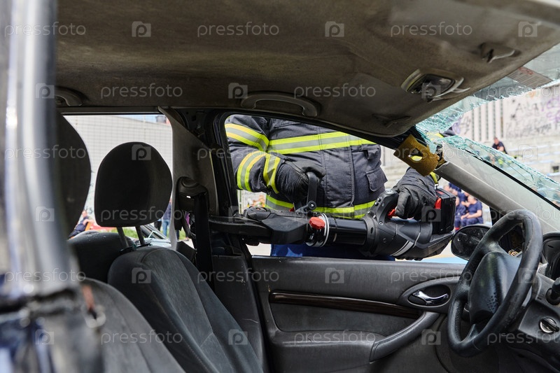 Специальная команда профессиональных пожарных использует специальные инструменты для разрезания и разрушения обломков транспортных средств, демонстрируя свое умелое сотрудничество и быстрое реагирование при спасении людей, попавших в автомобильную аварию
