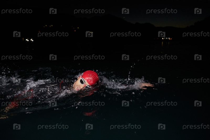 Решительный профессиональный триатлонист проходит тщательную ночную тренировку в холодной воде, демонстрируя преданность делу и стойкость в подготовке к предстоящим соревнованиям по триатлону по плаванию