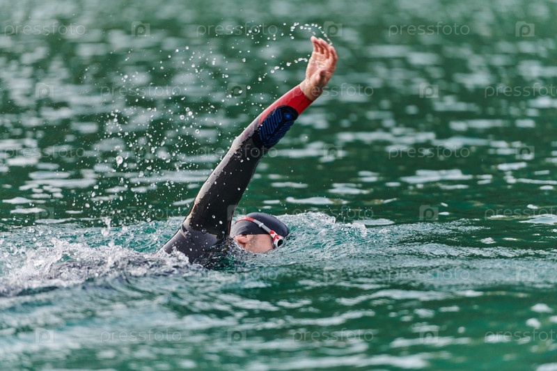 Профессиональный триатлонист с непоколебимой преданностью тренируется перед предстоящими соревнованиями на озере, излучая чувство атлетизма и глубокое стремление к совершенству