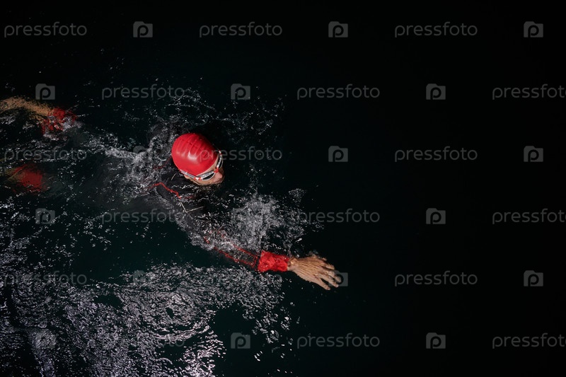 Решительный профессиональный триатлонист проходит тщательную ночную тренировку в холодной воде, демонстрируя преданность делу и стойкость в подготовке к предстоящим соревнованиям по триатлону по плаванию