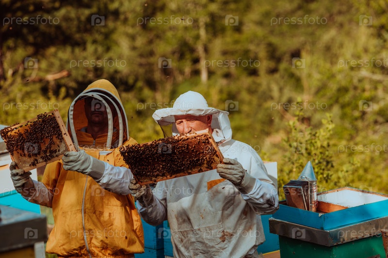 Пчеловоды проверяют мед на рамке улья в поле. Владельцы малого бизнеса на пасеке. Производитель натуральных здоровых продуктов питания работает с пчелами и ульями на пасеке